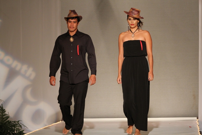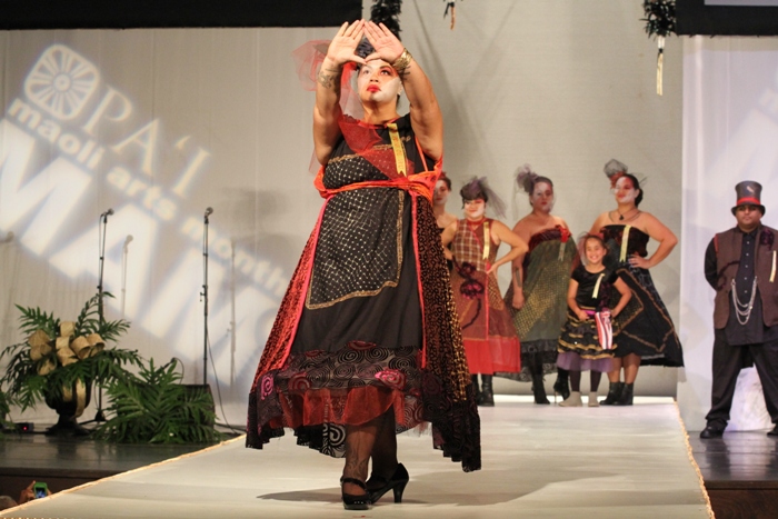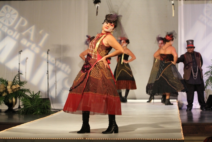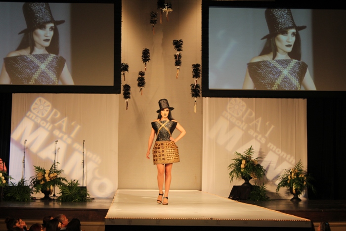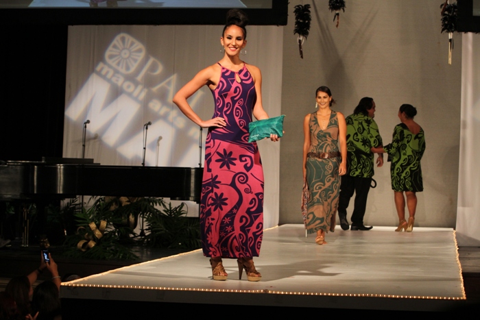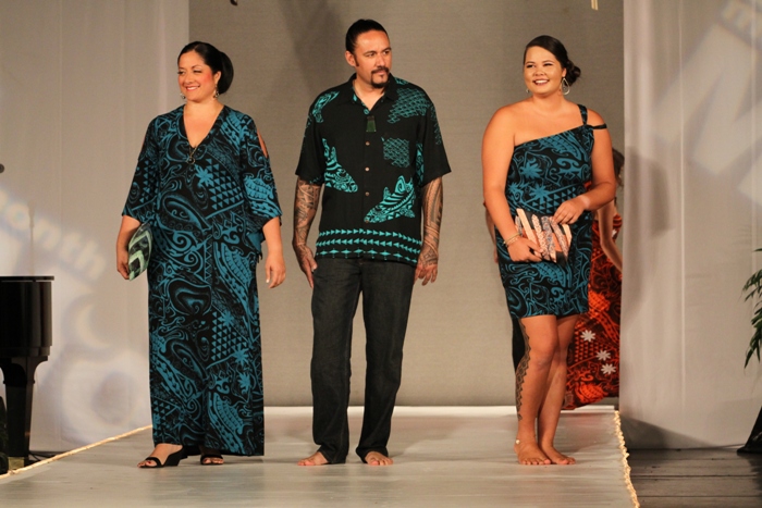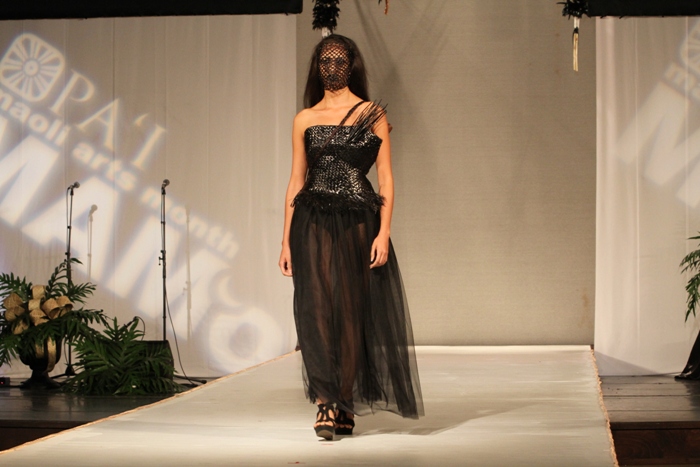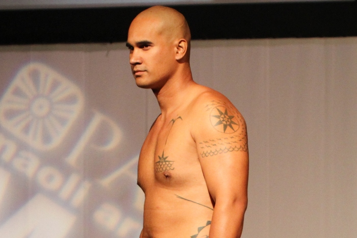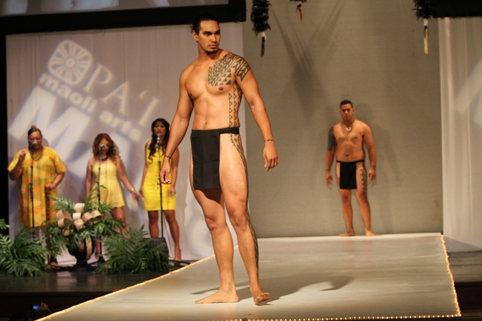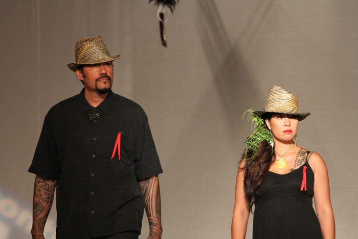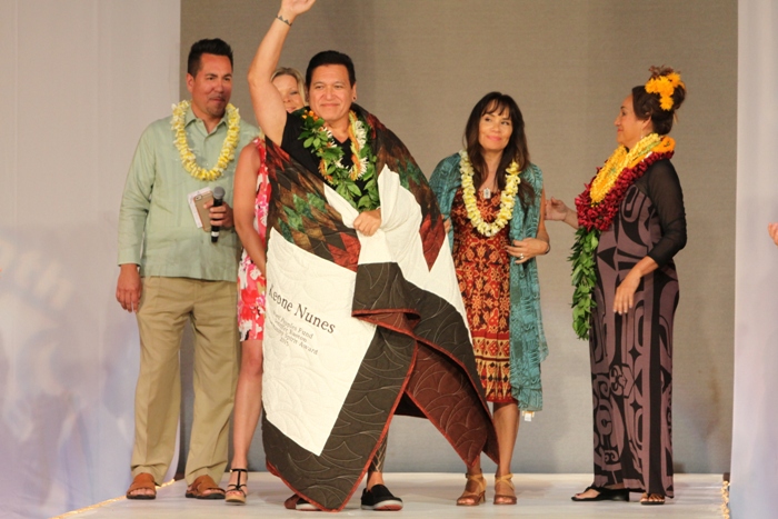 Representatives from The First People’s Fund, a non-profit organization based in South Dakota that supports indigenous artists presented Keone Nunes with the 2015 Jennifer Easton Community Spirit Award. He was recognized for his contribution to perpetuating the Polynesian culture through traditional tattooing (kakau) passed down from his elders. MAMo Wearable Art Show producer Vicky Holt Takamine was a past recipient of the award.