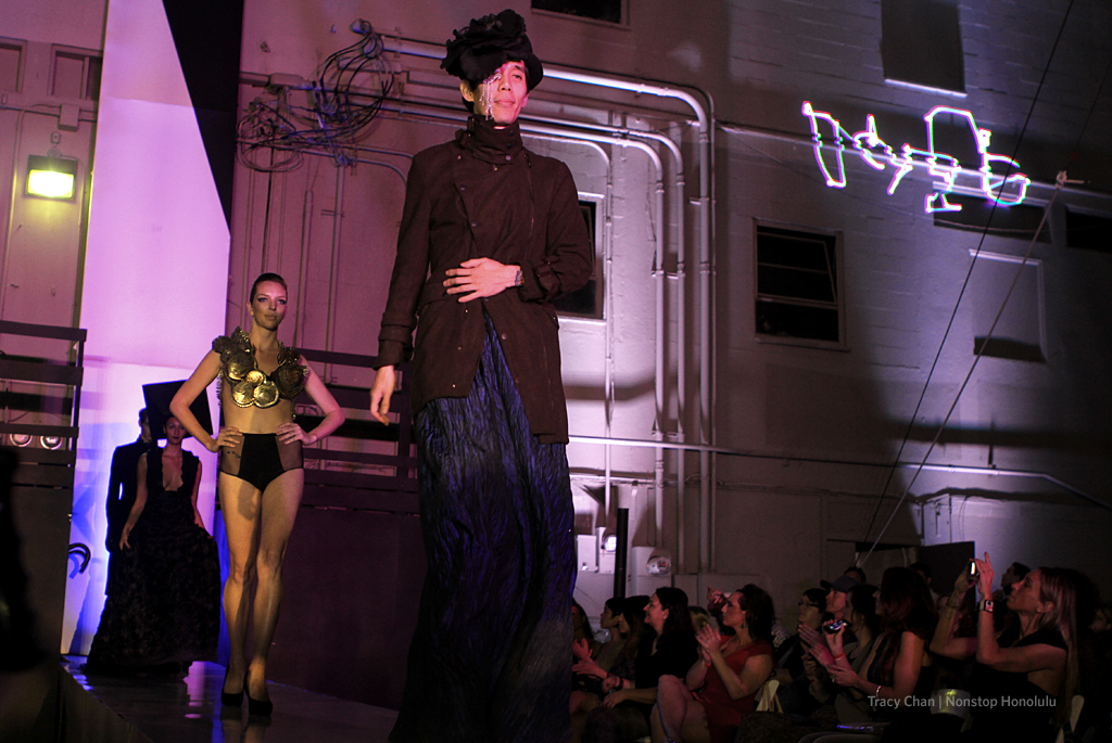 The Abstract Noir fashion show by Caleb Shinobi attracted an eclectic crowd Friday night at the Coexist Studio, located in the urban arts district in Kakaako. The ambitious show opened with an aerialist couple’s performance. Their creative and somewhat steamy presentation on the silks set the stage for the evening. Before the show, Shinobi briefly described the idea behind the show: “Abstract Noir is a fashion concept that will reflect the raw edge and art we find weaved within the urban landscapes on the island.”
